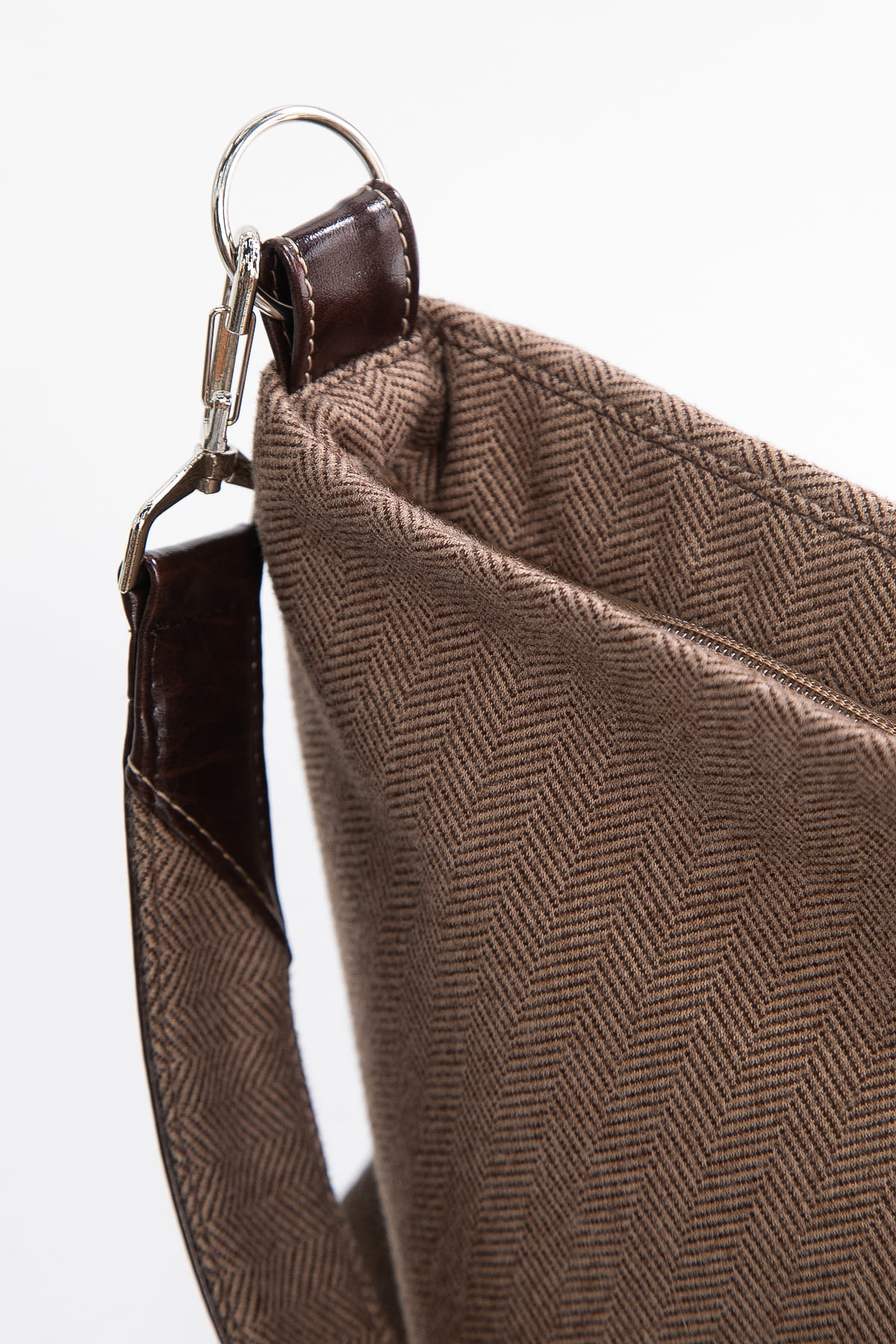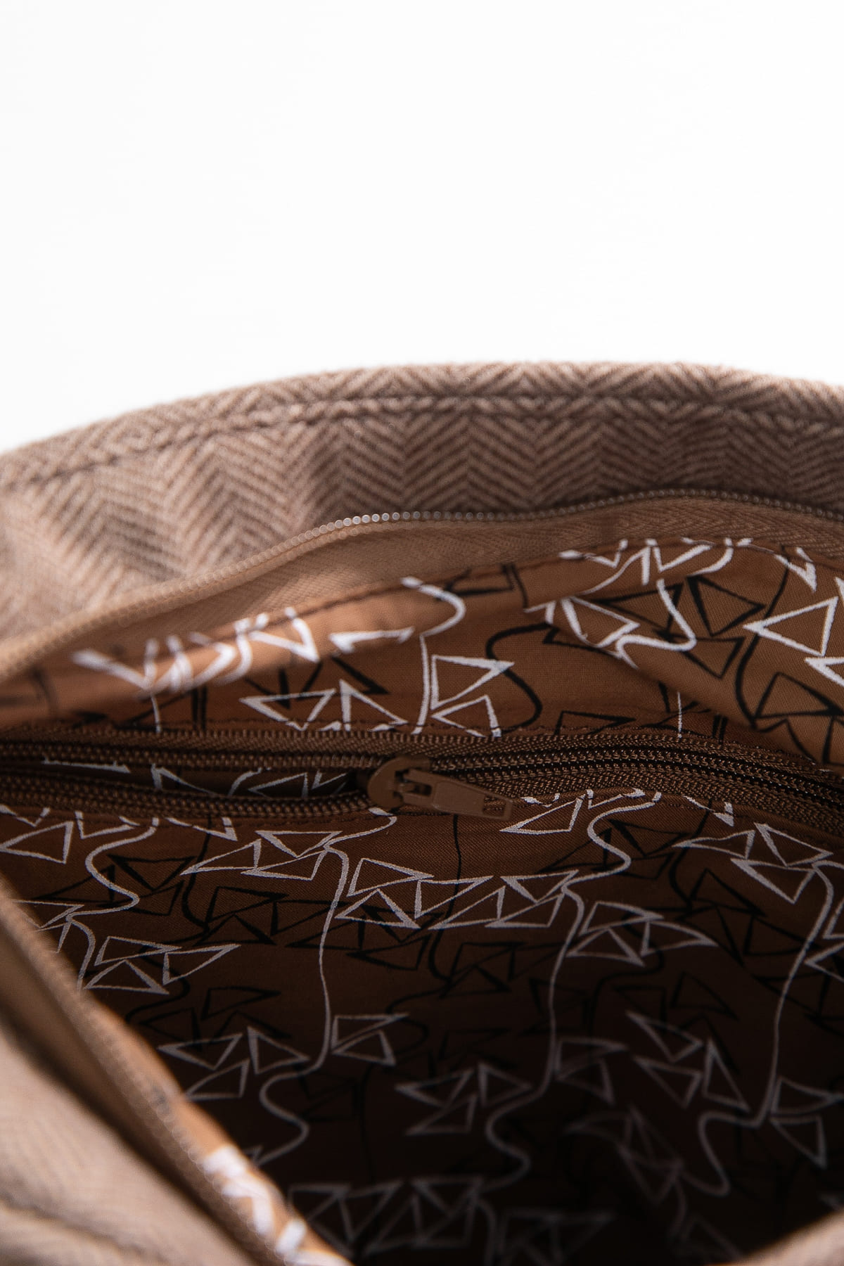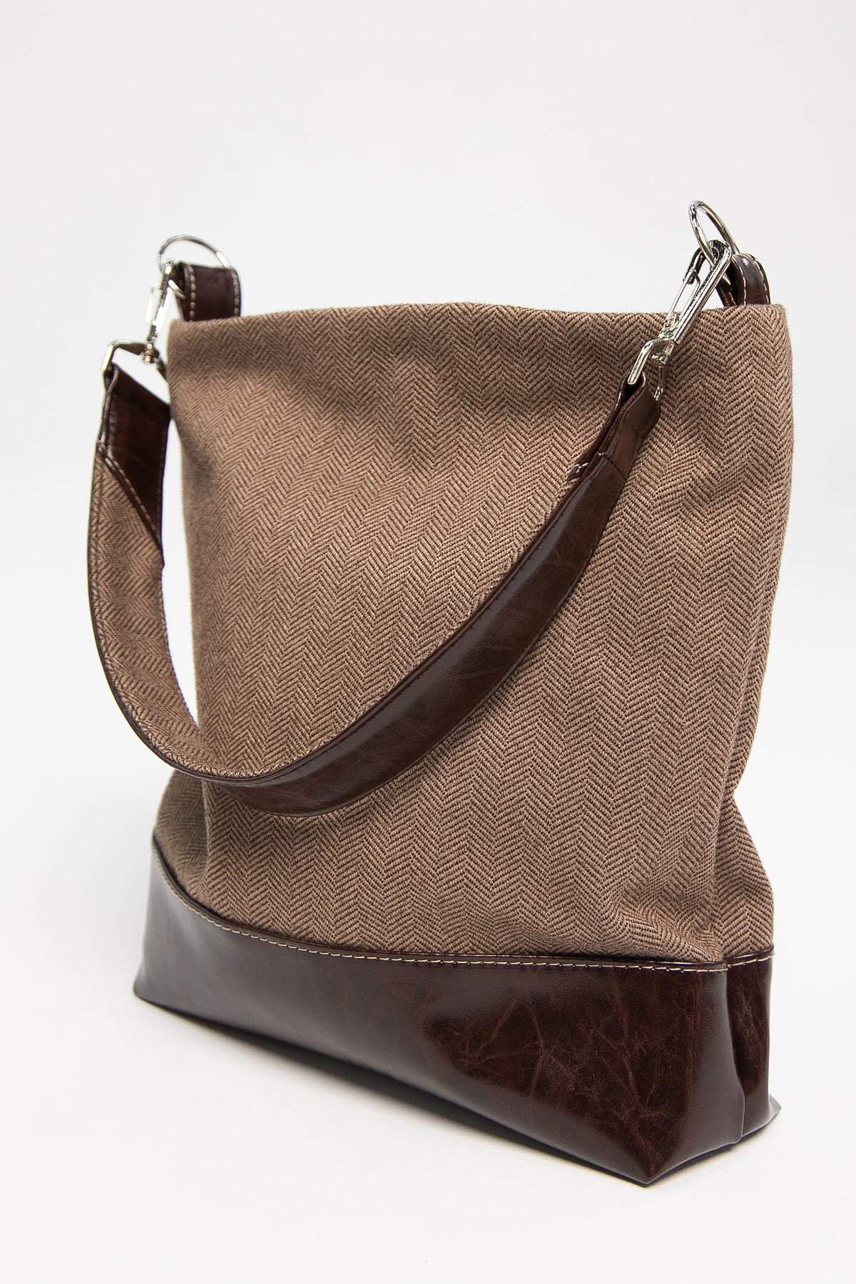 Декоративные строчки, выполненные в двух оттенках ниток, подчеркивают высокое качество и внимание к деталям. Особое внимание стоит уделить двусторонней ручке: углы из искусственной кожи, настроченные на костюмный драп, превращают её в настоящий декоративный элемент. Ручка крепится на съёмных, вращающихся карабинах и соединяется с шопером на кольца, что добавляет дополнительный комфорт.