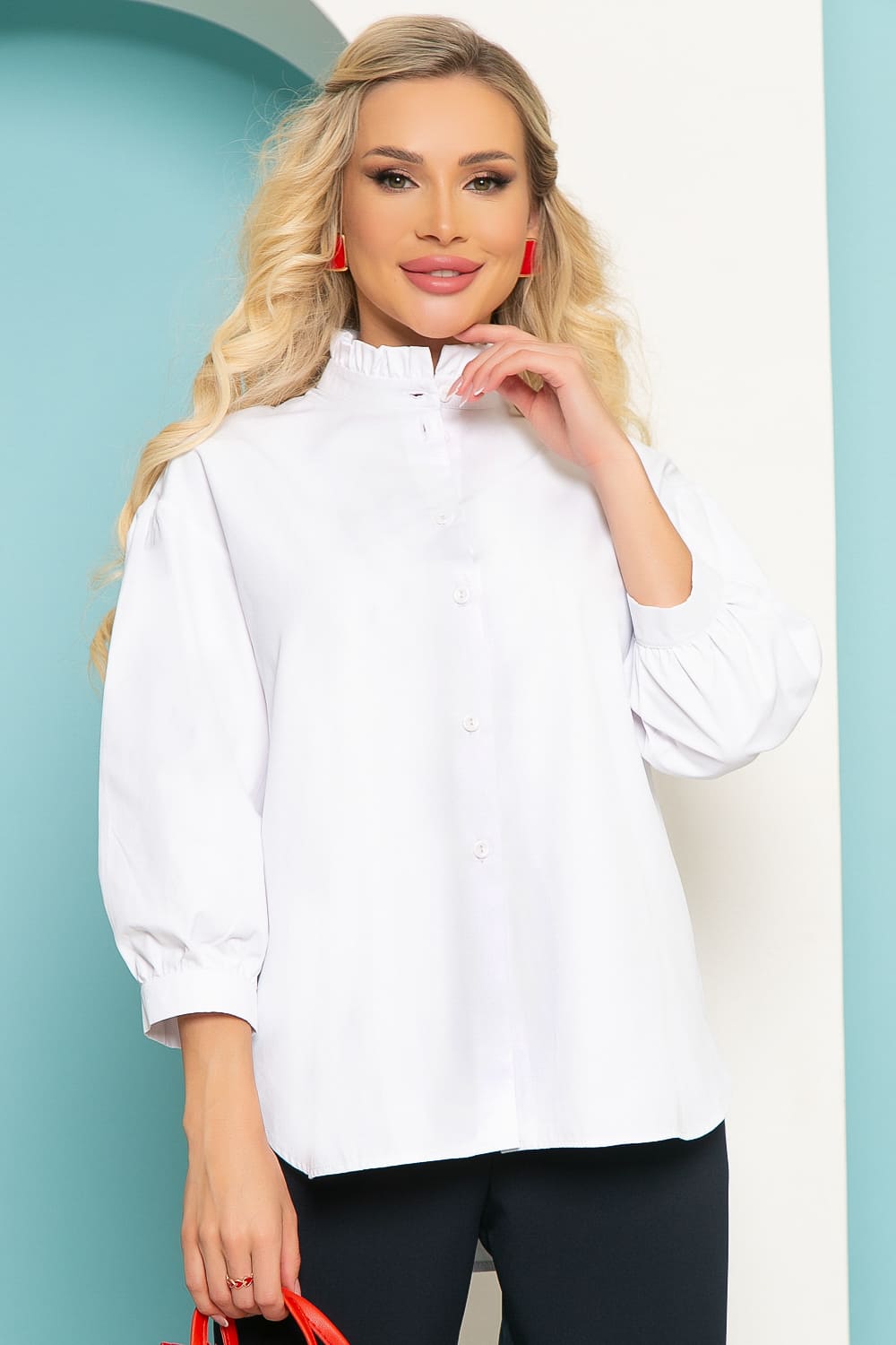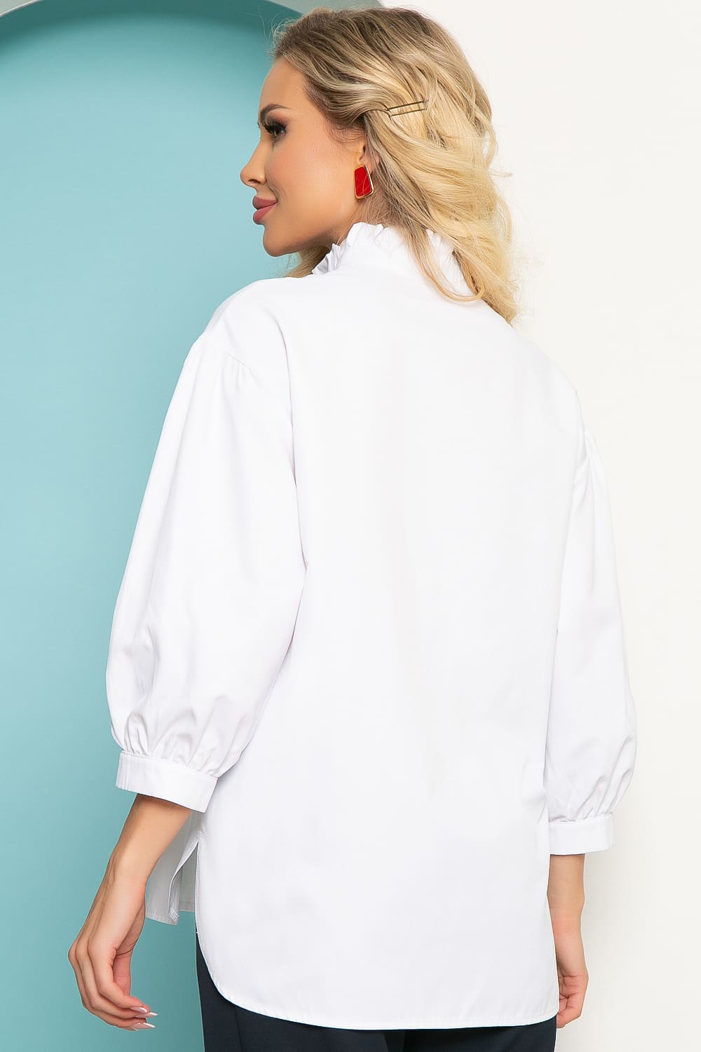 Красивый воротничок стойка со сборкой. Модный рукав фонарик на манжете. Линия плеча спущена, по переду планка с пуговками. Удлиненная спинка, скругленные края низа.
