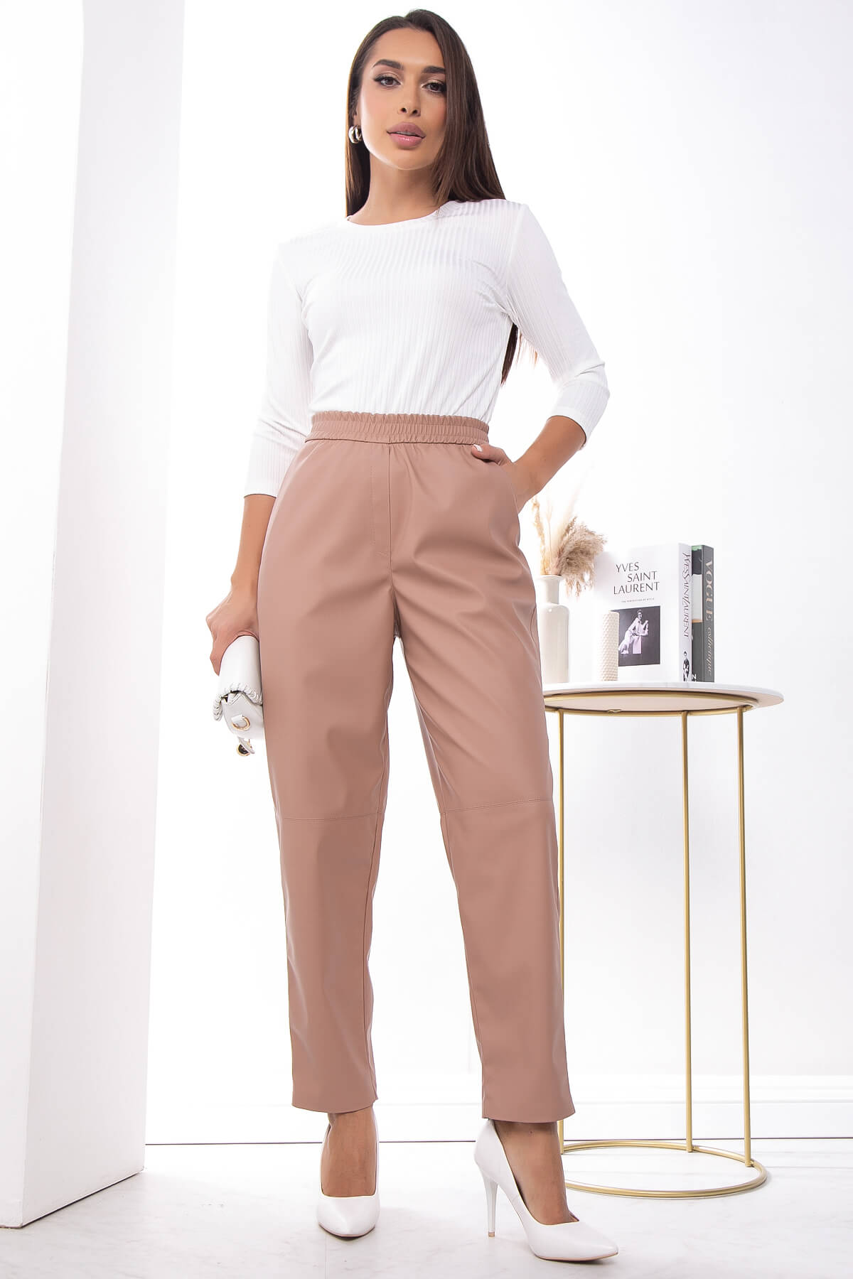 Брюки из экокожи для создания дерзкого повседневного образа. Брюки по талии на комфортной резинке, что гарантирует хорошую посадку на любом типе фигуры. Есть карманы.