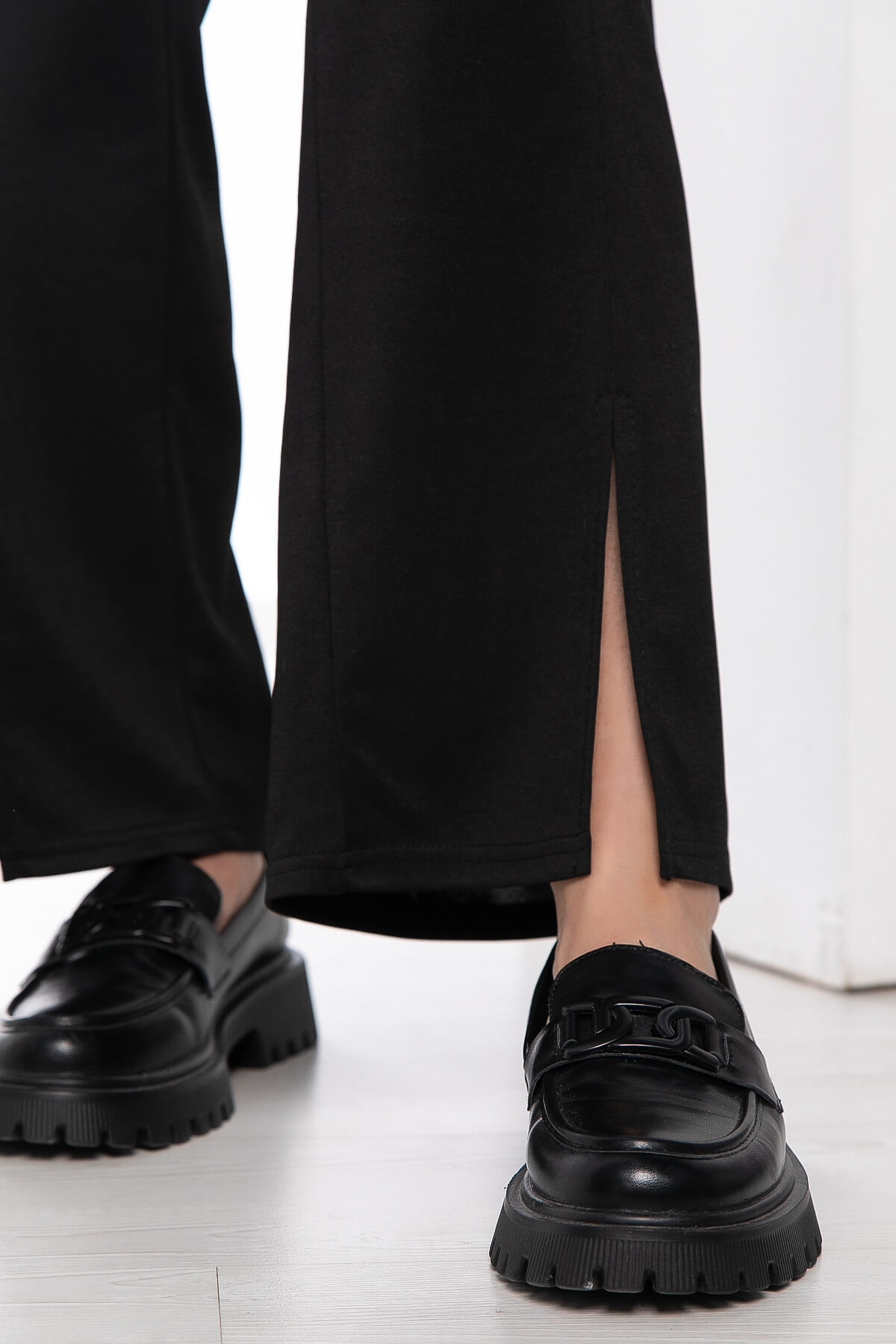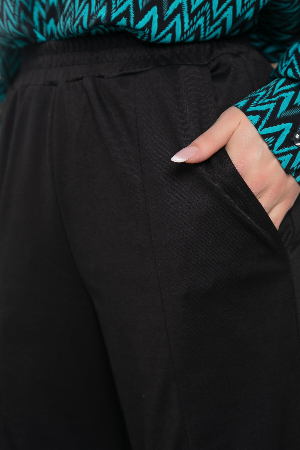 Свободные черный брюки на резинке с трендовыми разрезами по низу. Такая модель брюк практична и комфортна на каждый ден. Сегодня они актуальны для женщины любого возраста и в любой обстановке. Их можно гармонично сочетать с другими вещами Вашего гардероба. По талии брюки на резинке, что позволяет добиться комфортной посадки. По бокам брюк карманы.