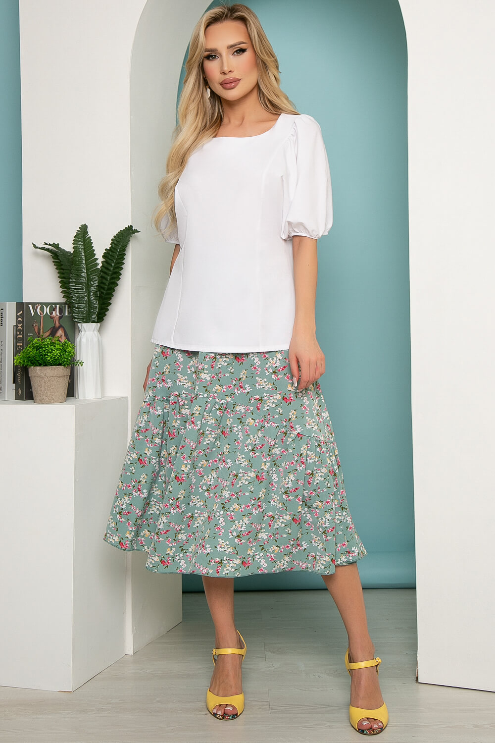 Очаровательный костюм из двух предметов: летящей юбки и блузы. Блуза свободного кроя. Мягкий, округлый вырез горловины, рукав втачной, скроен по типу "фонарик". Юбка с высокой посадкой, на резинке, А-силуэта, по низу волан на сборке с переходом длины.