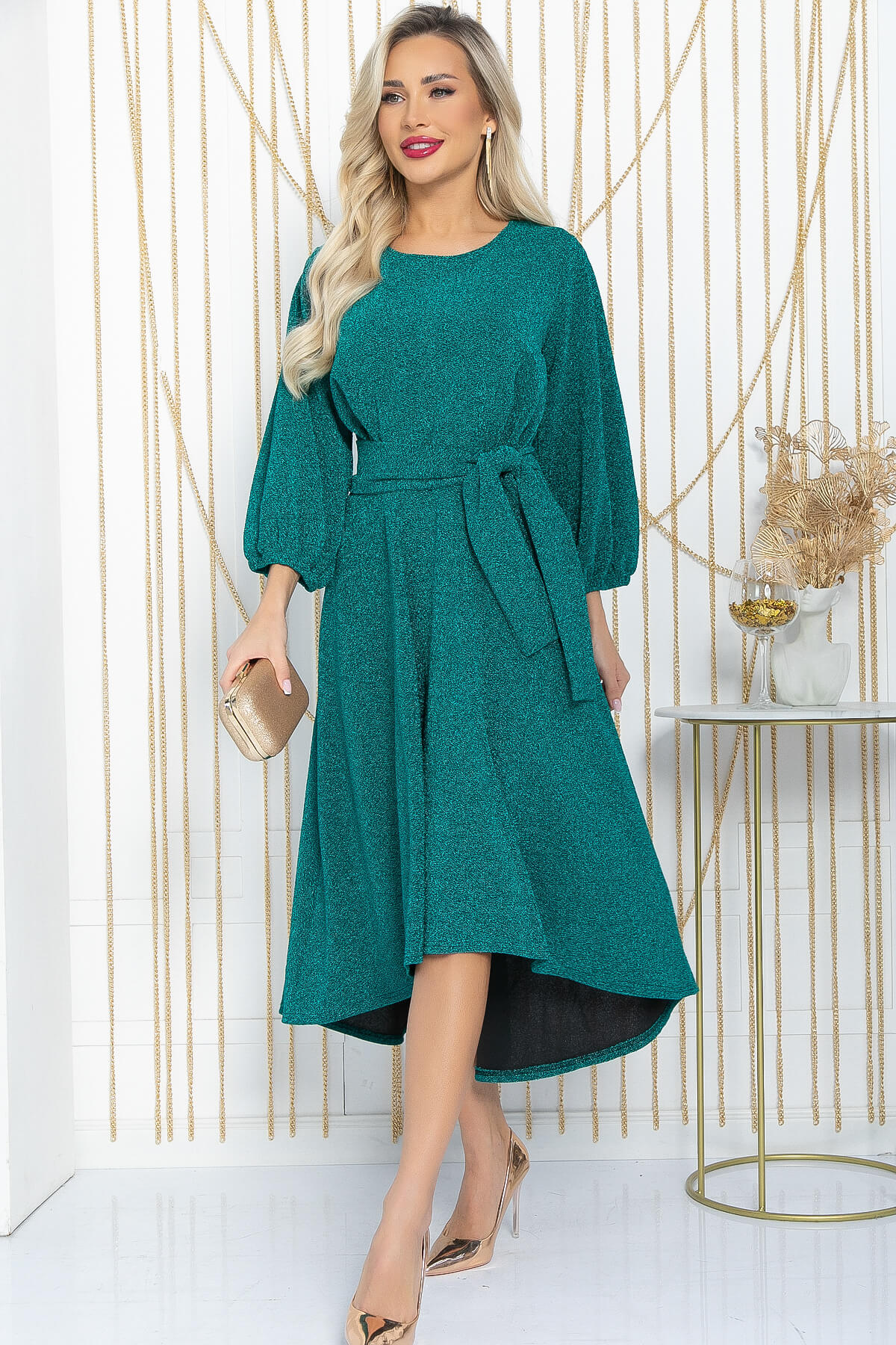 Вечернее платье из трикотажного полотна с люрексом - эффектная модель, которая окажется в центре внимания на любом праздничном мероприятии. Платье в длине макси, отрезное по талии. Втачной пышный рукав три четверти собранный по низу на резинку - изюминка платья, выглядит кокетливо и нежно. Округлый вырез горловины делает образ женственным и аккуратным. Ассиметричная расклешённая юбка придаёт платью лёгкую игривость. В комплект входит пояс из основной ткани, который позволяет подчеркнуть талию.