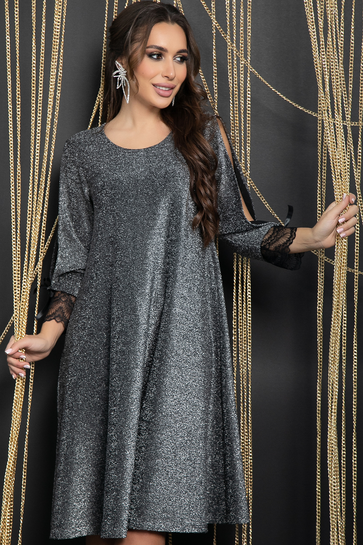 Платье, искрящееся, как Ваше настроение в Новогоднюю ночь! А-силуэт позволит Вам чувствовать себя максимально комфортно, ведь он не облегает фигуру, что является преимуществом в череде праздничных событий. Главной особенностью платья является его рукав три четверти с разрезом. Украшен атласными лентами, которые можно завязать, и кружевом по нижнему краю, что придаёт ему изысканный вид.