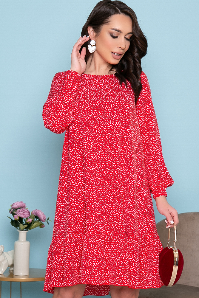 Маленькое платье с акцентом на спинке. Изящный бант создаст лёгкий непринуждённый образ. Платье свободного кроя с широким воланом по низу прекрасно подойдёт на любую фигуру, скрыв её недостатки. Рукав втачной, длинный, низ на резинке.