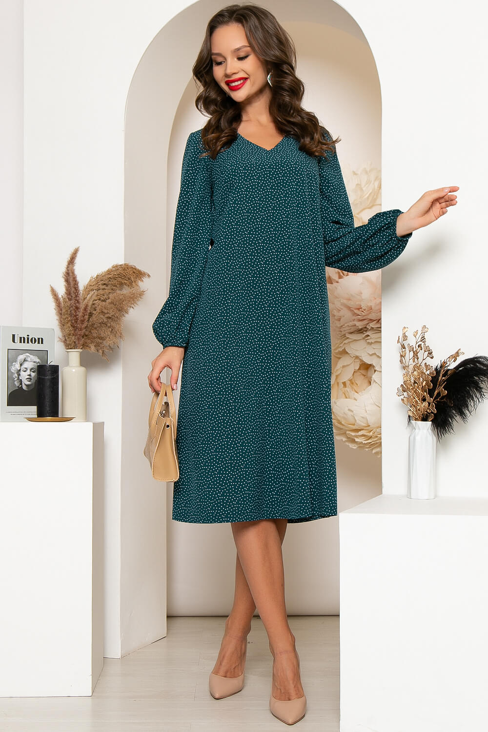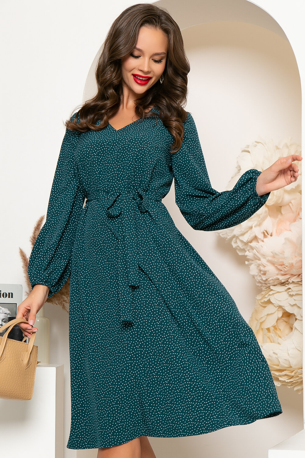 Струящееся платье в изумрудном оттенке, подчёркивающее Вашу женственность. Платье А-силуэта с красивым V-образный вырезом горловины красиво очертит зону декольте. Комфортный длинный рукав на резинке. Пояс из основной ткани входит в комплект.