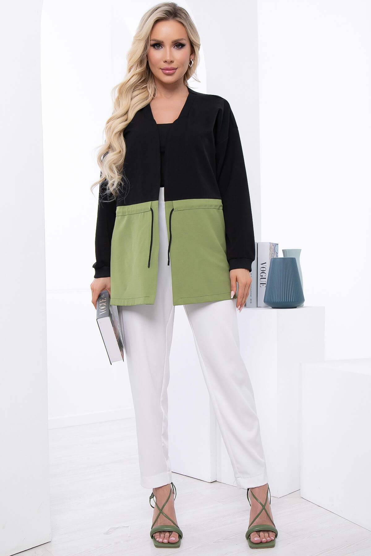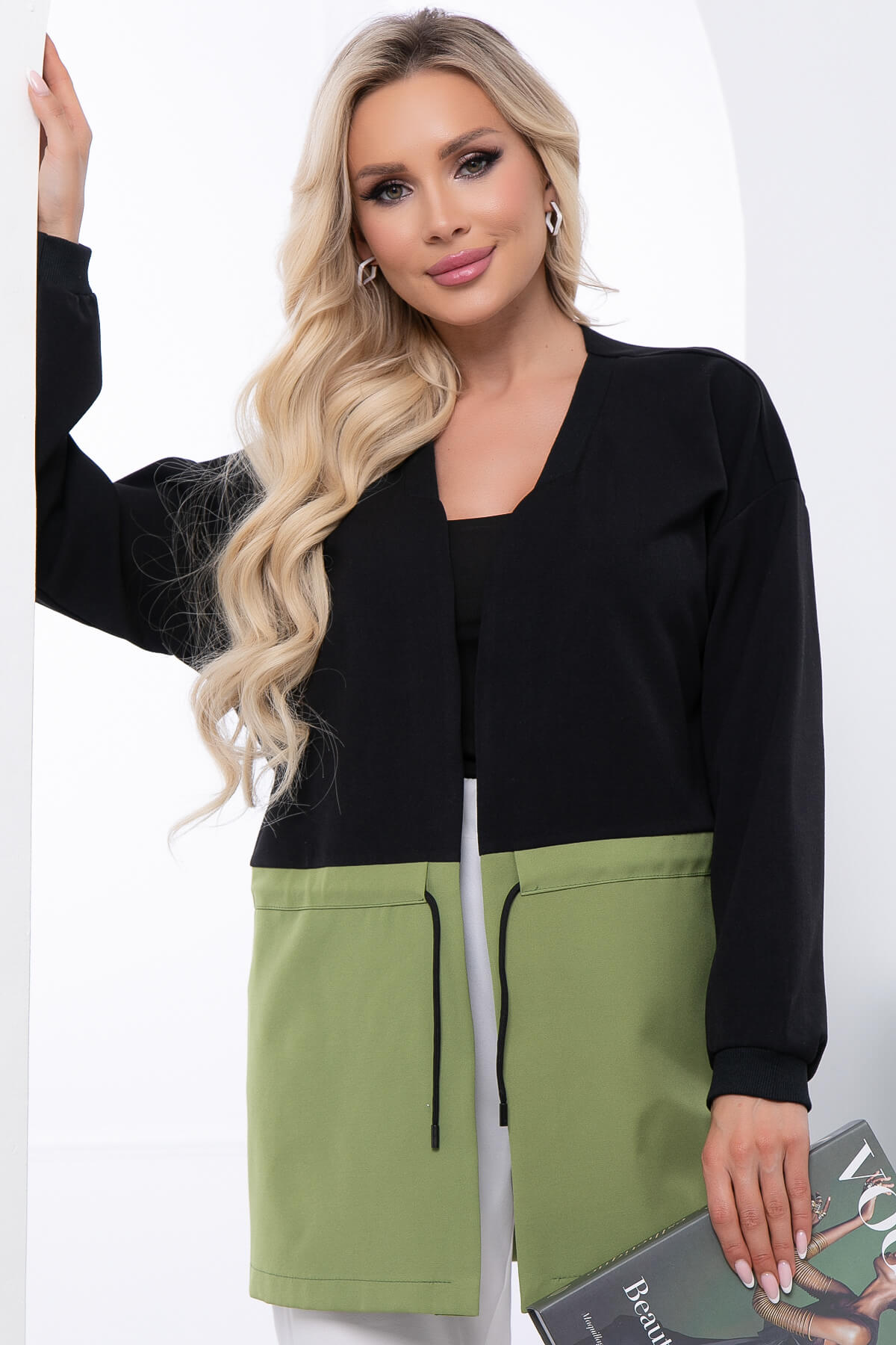 Жакет из костюмной ткани в ярком сочетании чёрного и оливкового цветов выглядит стильно и очень эффектно.