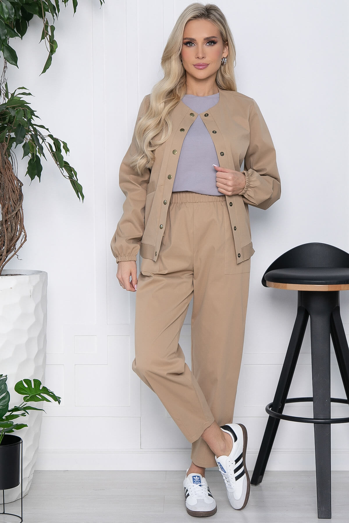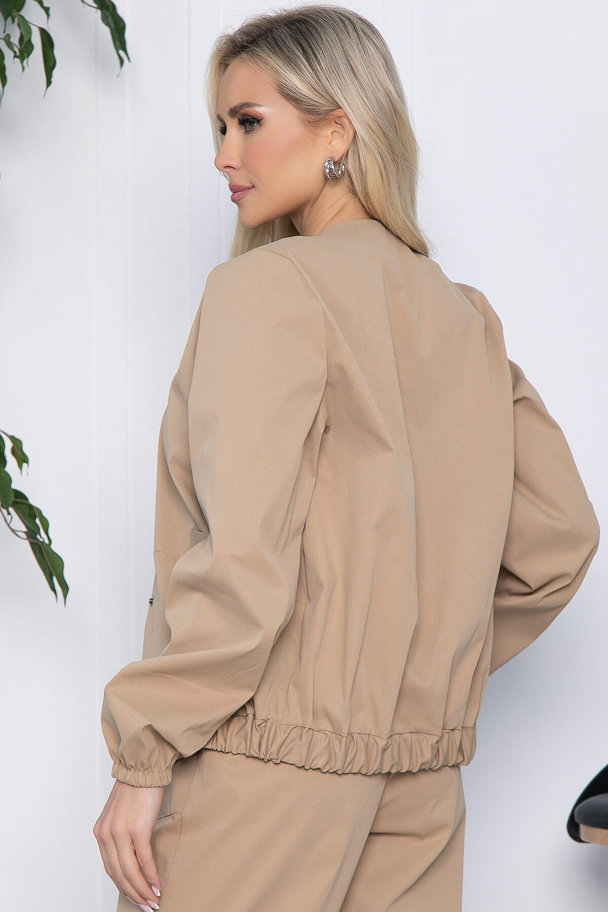 Куртка-бомбер в бежевом оттенке - идеальный вариант для летнего гардероба! Когда на улице ветрено, надевайте под него лонгслив, а если тепло, то майку или футболку. Рукав втачной, длинный, по переду застегивается на кнопки, есть карманы.